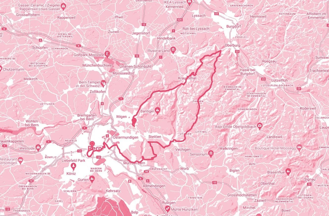 Die Strecke führt von Bolligen über Habstetten, den Zimmerberg, durch das Lauterbachtal nach Boll-Vechigen, über den Dentenberg und auf schönstem Weg vor den Bundesplatz in Bern. Dieses Jahr wird die Zieleinfahrt in der Bundesgasse sein.